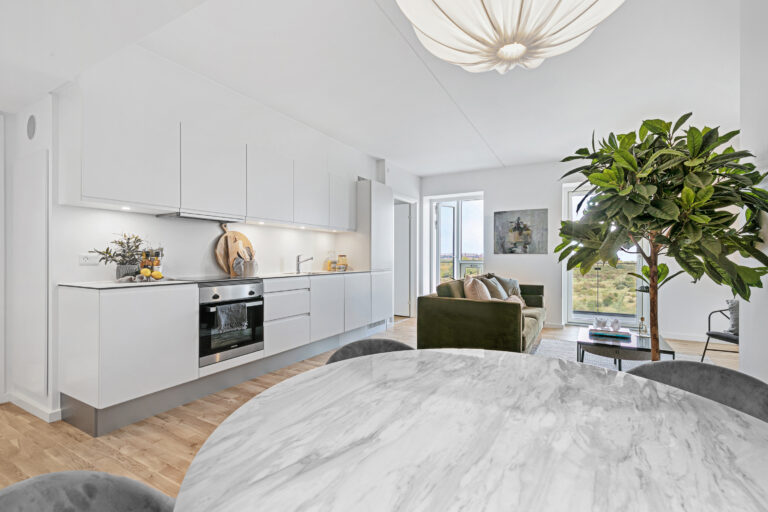 The flats have recessed window sections with seating niches, so you can sit on the windows and look over Amager Fælled. The windows are made of raw aluminium and protected by galvanised steel. The square shape of the windows further creates a pictorial effect when looking outside, while also creating a broad inflow of light in the flats. All the flats are designed with open kitchen-dining areas with quality Invita kitchens.