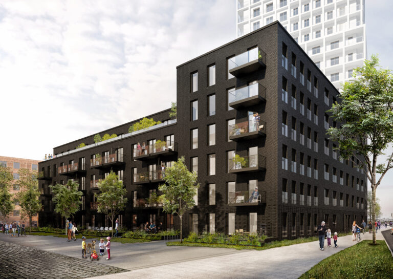 a dark brick base which frames a green, natural courtyard environment. The flats at the base of the tower ascend
