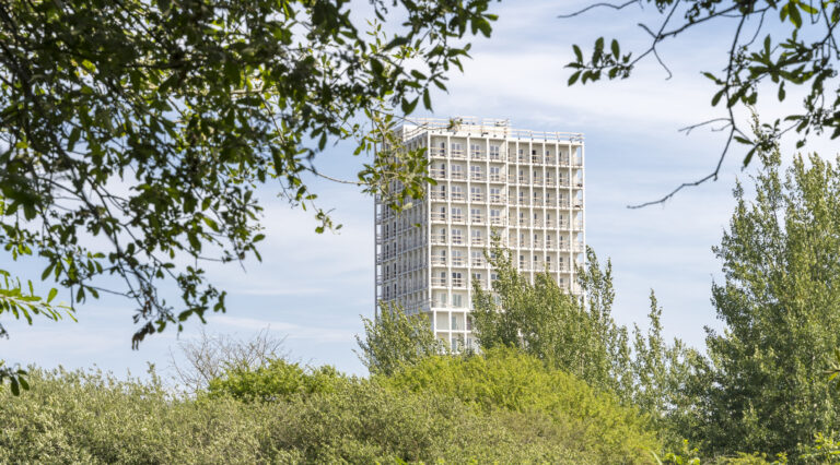 the Bella Neighbourhood. The 60-metre flat tower is designed in a white grid of raw concrete panels placed on